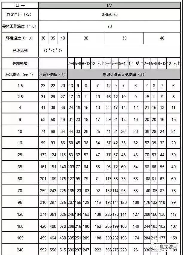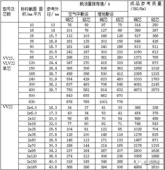 常見電纜的載流量一覽表