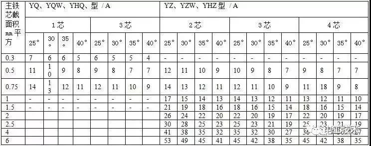 通用橡套軟電纜的載流量(450V/750V及以下橡膠絕緣電力電纜YQ、YQW、YHQ、YC、YCW、YHC型號的載流量